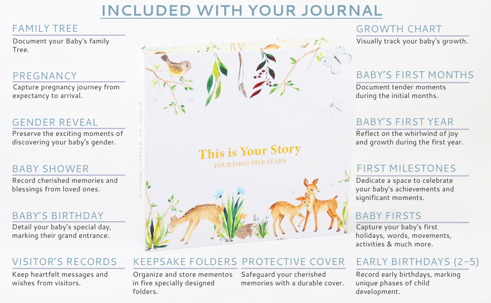 With six generous keepsake folders, this book provides dedicated spaces for notes and photos. These special compartments offer a personalized and secure haven for preserving the most cherished moments of your baby’s journey. As you flip through each page, the keepsake folders become a treasure trove of memories, adding an extra layer of emotional resonance to your baby’s story.