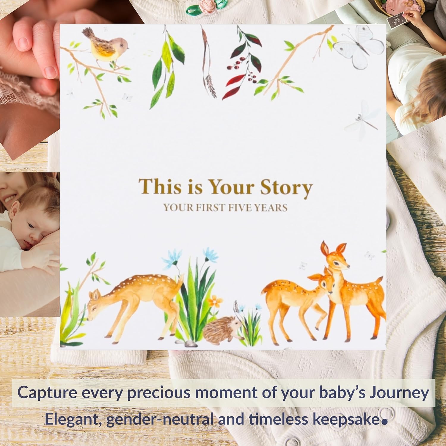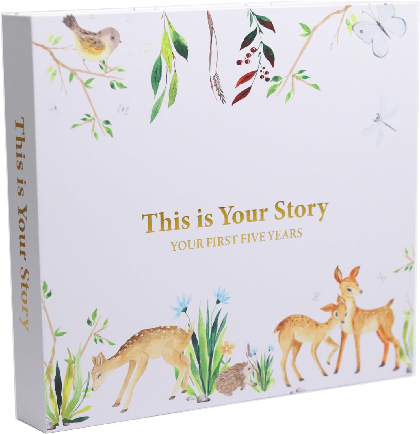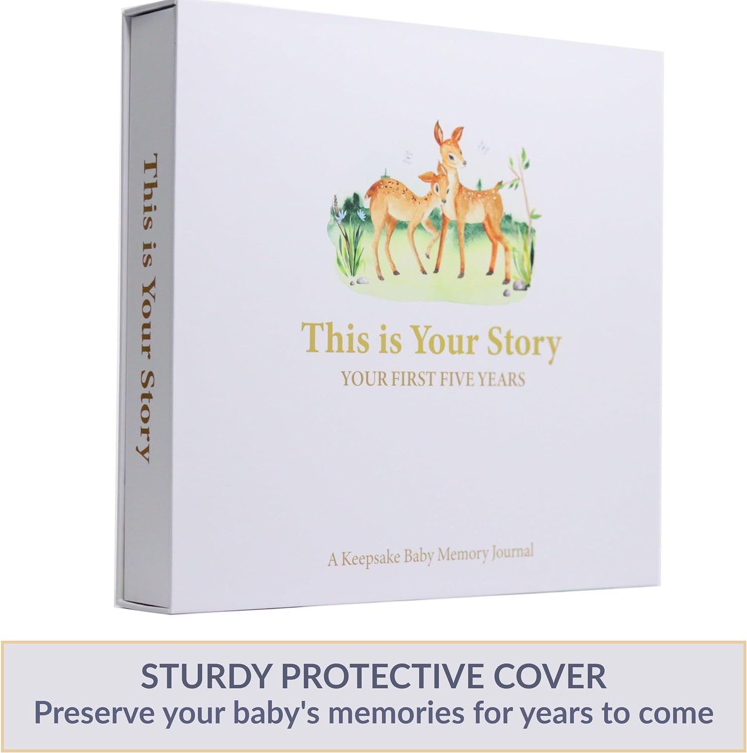• Crafted from the finest material, this elegant design with gold-imprinted cover features a charming forest animals theme. Our baby keepsake book consists of a 132 high-quality 160 gsm cream-colored pages bounded by a golden double spiral spine. With a simple-to-follow structure, it allows you to document precious moments effortlessly. It features 5 large keepsake pocket pages for timeless photos. A bonus of gold pen with a black velvet pen pouch. Ideal gift for any baby registry items.