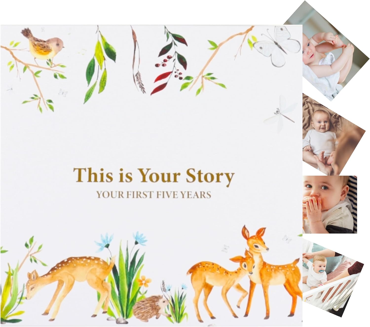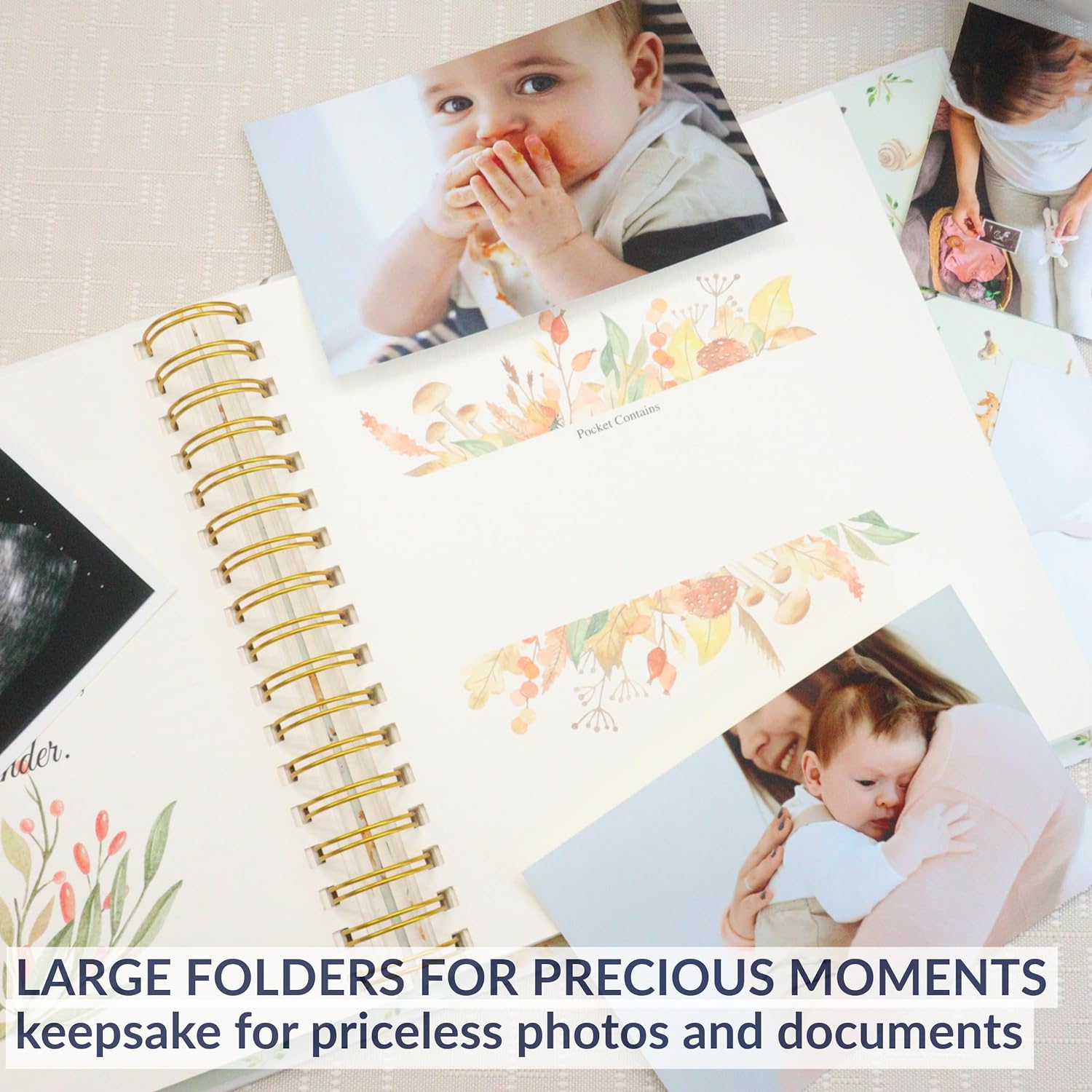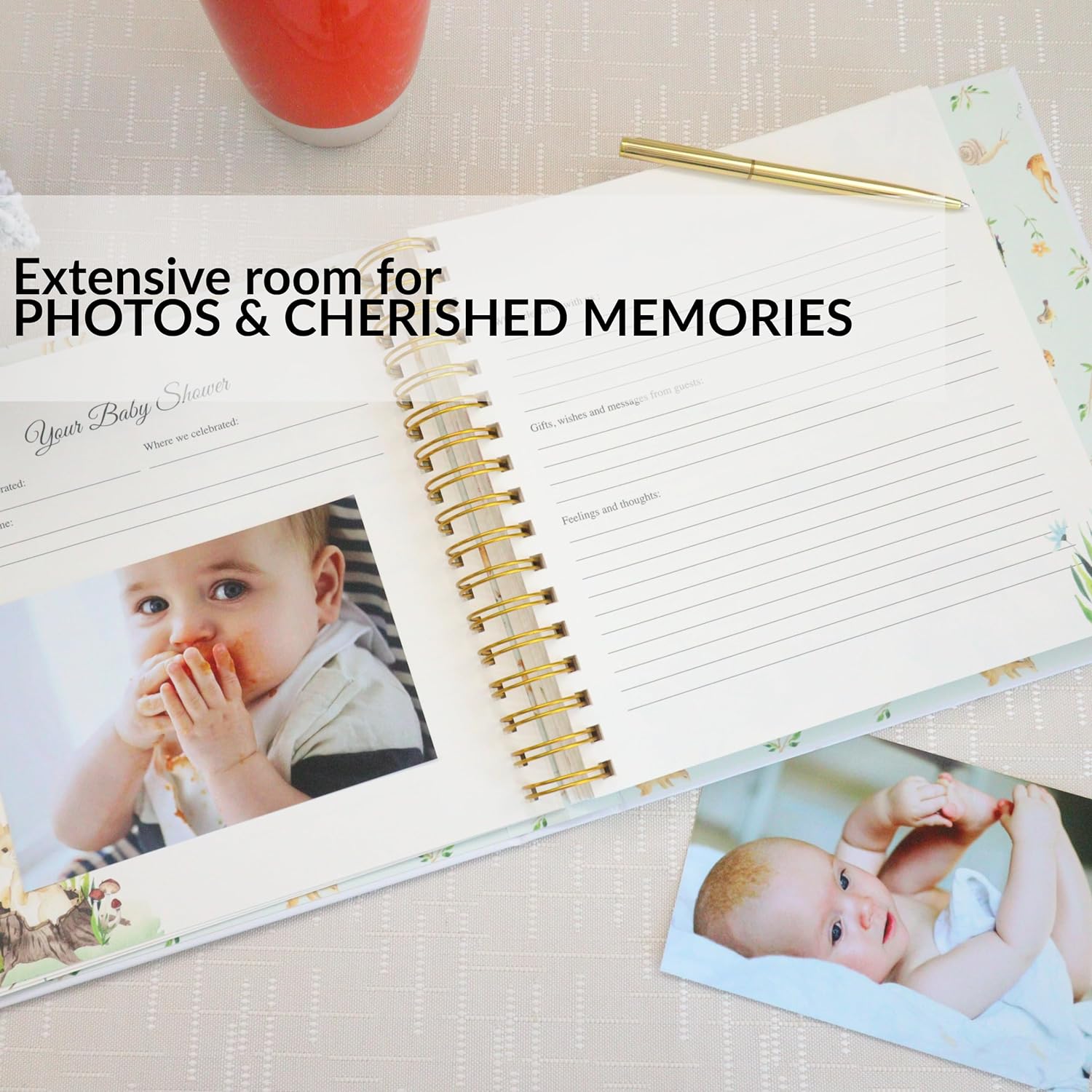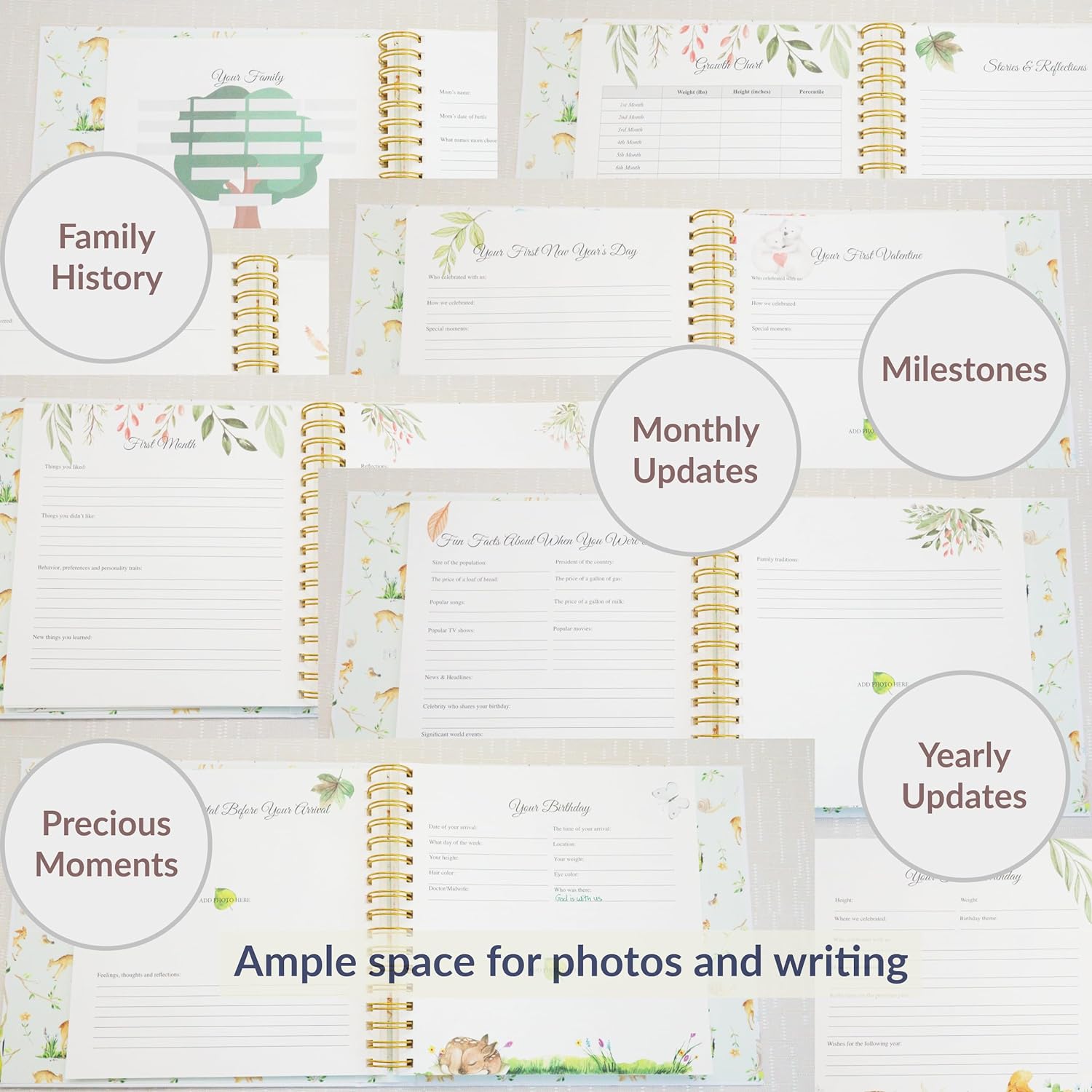 • Crafted from the finest material, this elegant design with gold-imprinted cover features a charming forest animals theme. Our baby keepsake book consists of a 132 high-quality 160 gsm cream-colored pages bounded by a golden double spiral spine. With a simple-to-follow structure, it allows you to document precious moments effortlessly. It features 5 large keepsake pocket pages for timeless photos. A bonus of gold pen with a black velvet pen pouch. Ideal gift for any baby registry items.