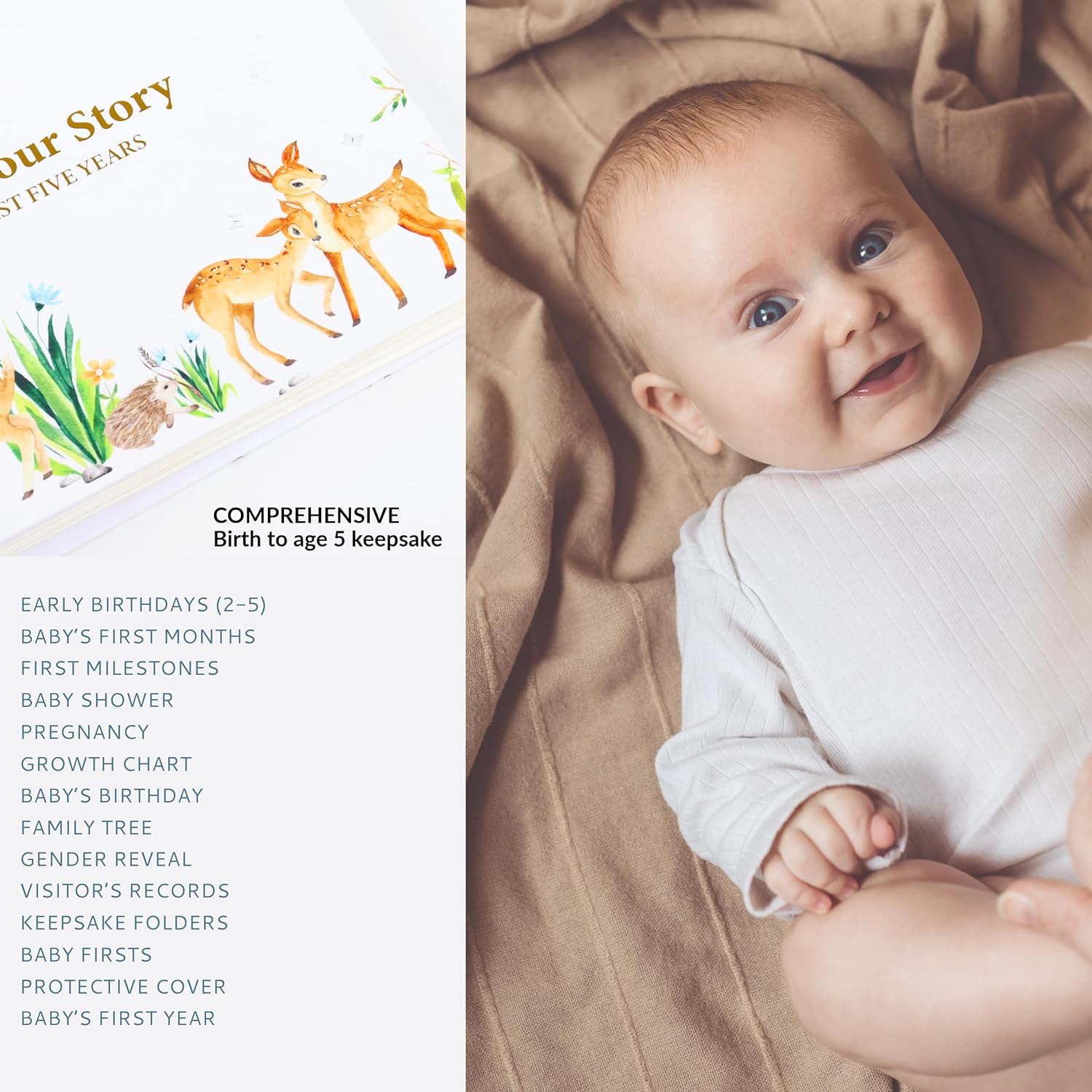 • Our keepsake memory book is thoughtfully designed to help you capture and cherish every precious moment of your baby’s journey. It beautifully journals big moments and important baby milestone from birth to age 5. This easy-to-follow baby scrapbook also provides plentiful space for photos. Our baby memory book is gender-neutral baby gift suitable for both baby boys and baby girls, offering a timeless and inclusive way to celebrate your little one’s early years.